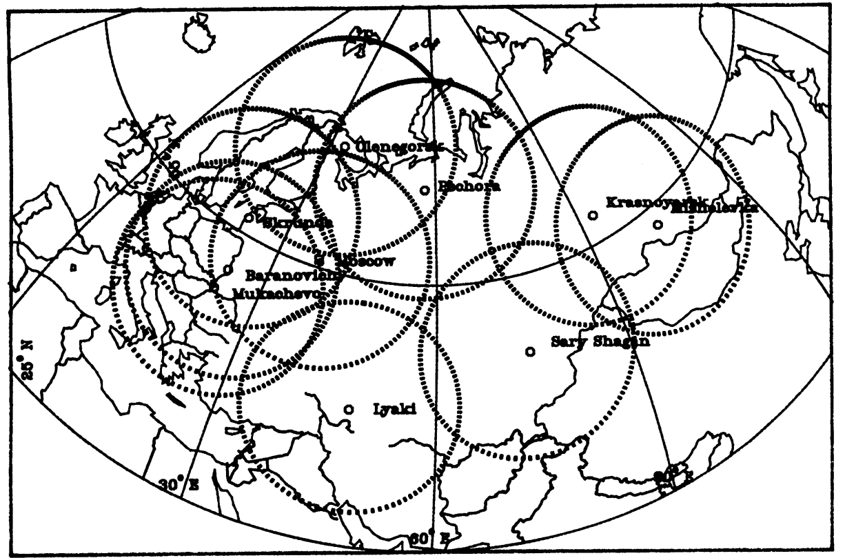 The attacked graphic depicts all nine LPARs and Moscow, with circles 1300 KM in radius for each. (U)