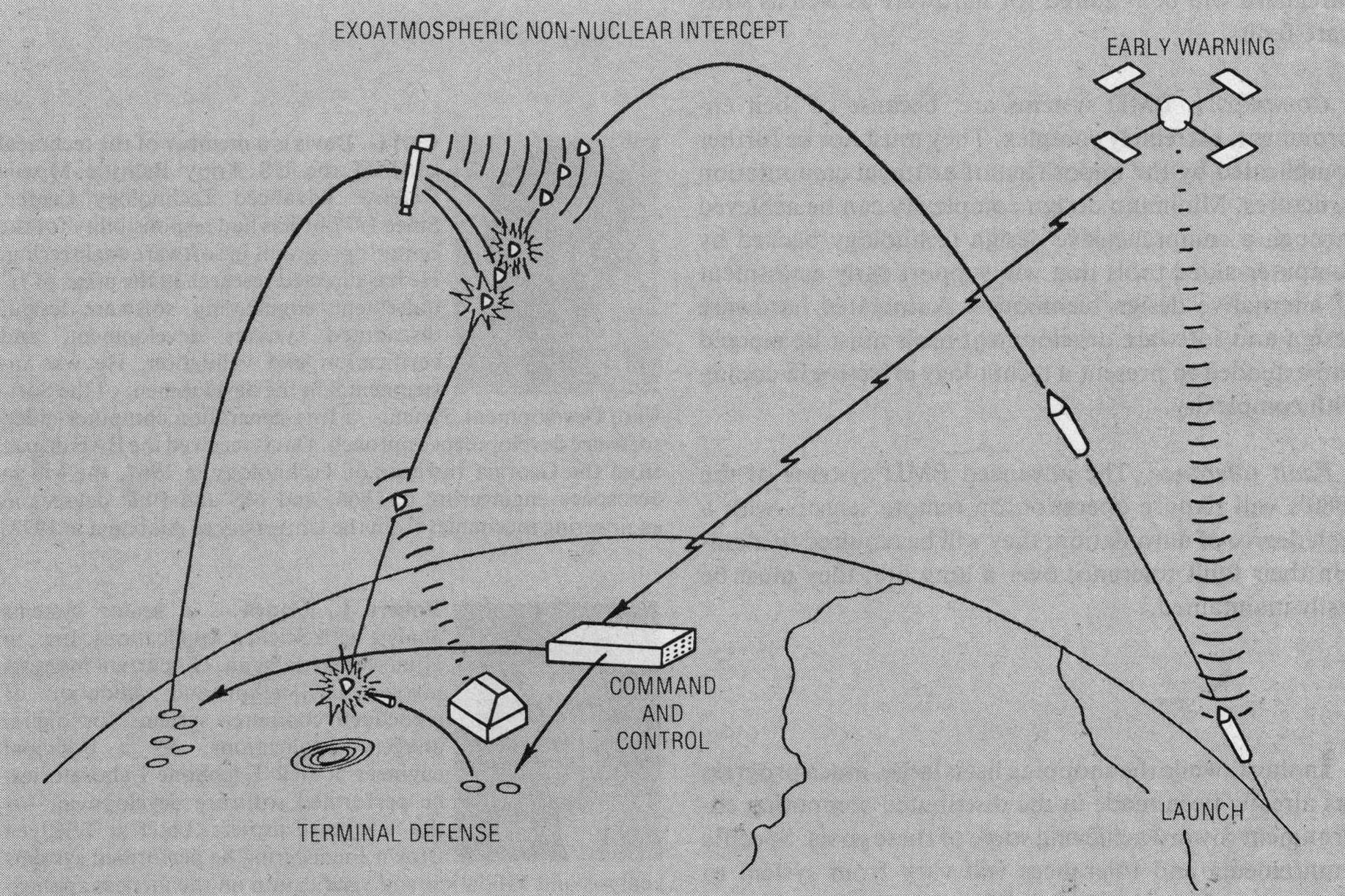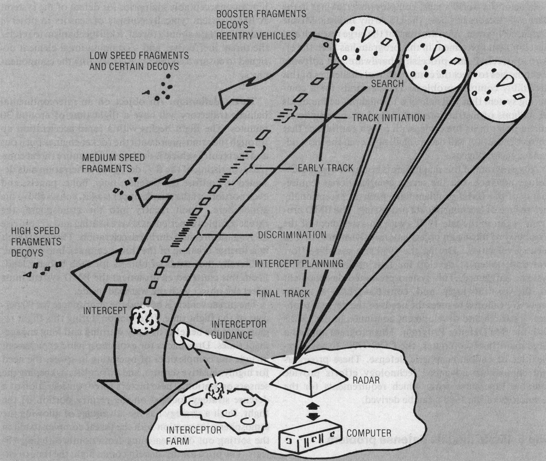 THE DEFENSE SYSTEM. A terminal defense system illustrates the complexities of BMD. The main system sensor is a phased array radar that can generate a pencil beam pointable, within a few microseconds, in any direction within the surveillance volume. Beams are either transmit or receiver beams; each transmit beam can generate any one of a number of different pulse configurations (carrier frequency, number of pulses, pulse coding, frequency modulation, pulse length, etc.). Each receiver beam can likewise assume any one of a number of configurations (carrier frequency, range extent, matched filter, etc.). Typically, the radar generates several thousand transmit beams per second and a proportionate number of receive beams. Generally, several hundred transmit and receive beam pairs are reserved for searching the upper part of the surveillance volume. These are generated in a raster scan pattern designed so no object can penetrate the volume without detection by at least one search beam. A variety of special beams are interleaved randomly in both time and space among the search beams, as required by the target environment and battle situation. These verify search detections, provide precision tracking of previously detected and acquired targets, transmit guidance commands to interceptors, perform target discrimination and classification, and perform several other functions.