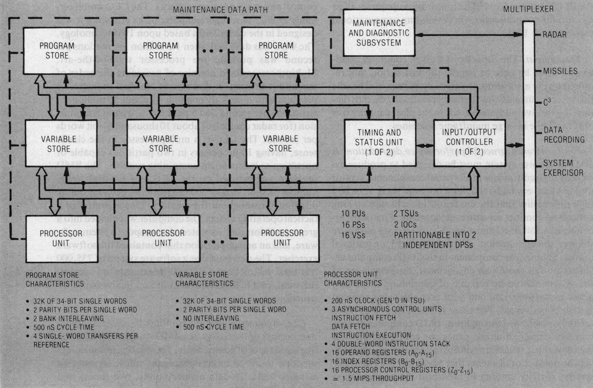 The architecture also contains separate peripheral processing units to handle I/O. The control section of the CPU can delegate data transfer directly to an independent, programmable channel controller. With the CPU itself never slowed down by time-consumιing communications management activities, its timeline can be devoted entirely to “number crunching.” The combination of all these architectural features is a computer configuration with demonstrated throughput on an actual BMD instruction mix in excess of 19 MIPS, or million instructions per second.