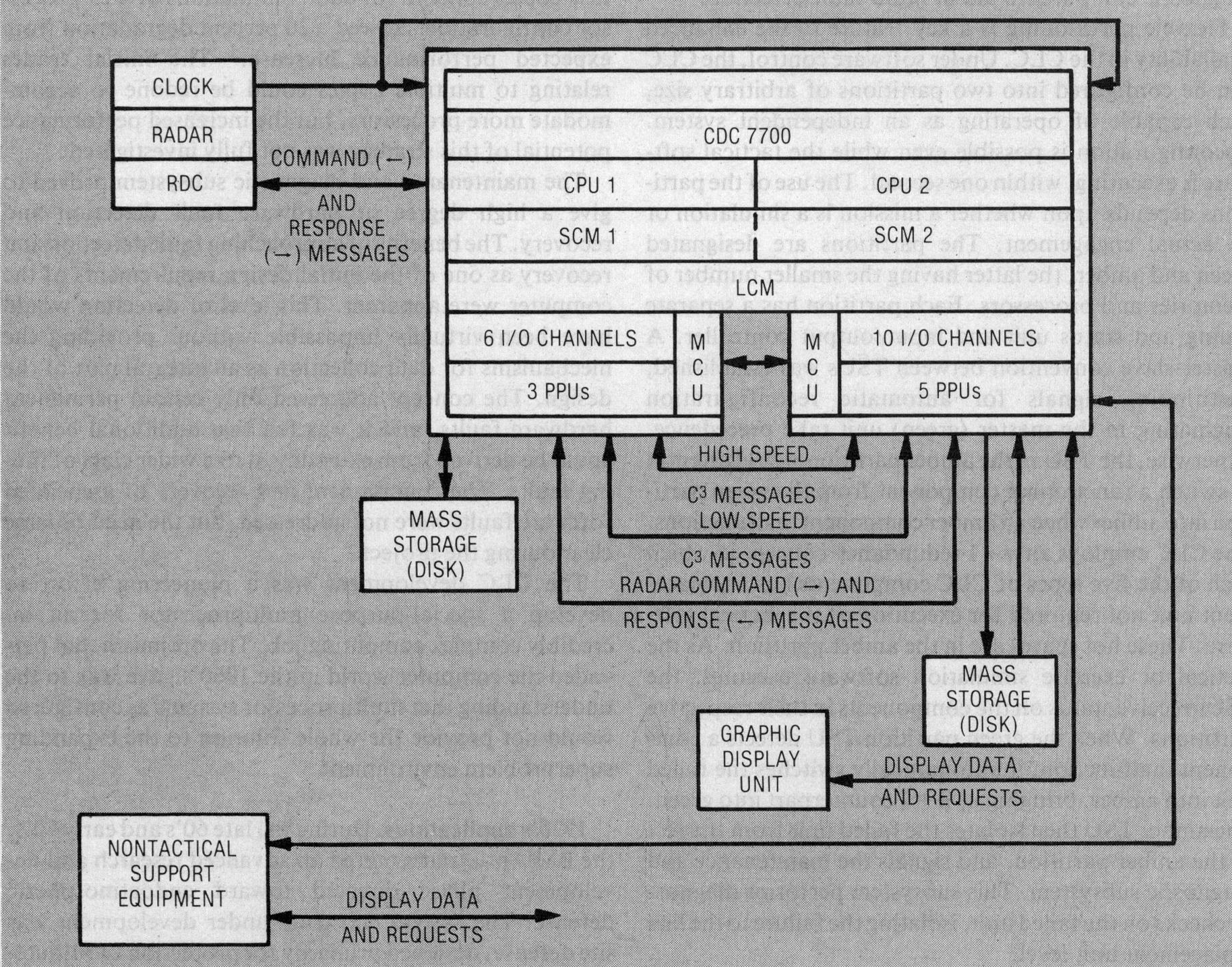 Communications between any executing programs are handled by PPUs. Tasks executing in each CPU cannot communicate with each other directly through the LCM. Several items of special equipment were added to the commercial computers, principally a setable internal clock for use as a time standard and to provide access to the radar time source.
