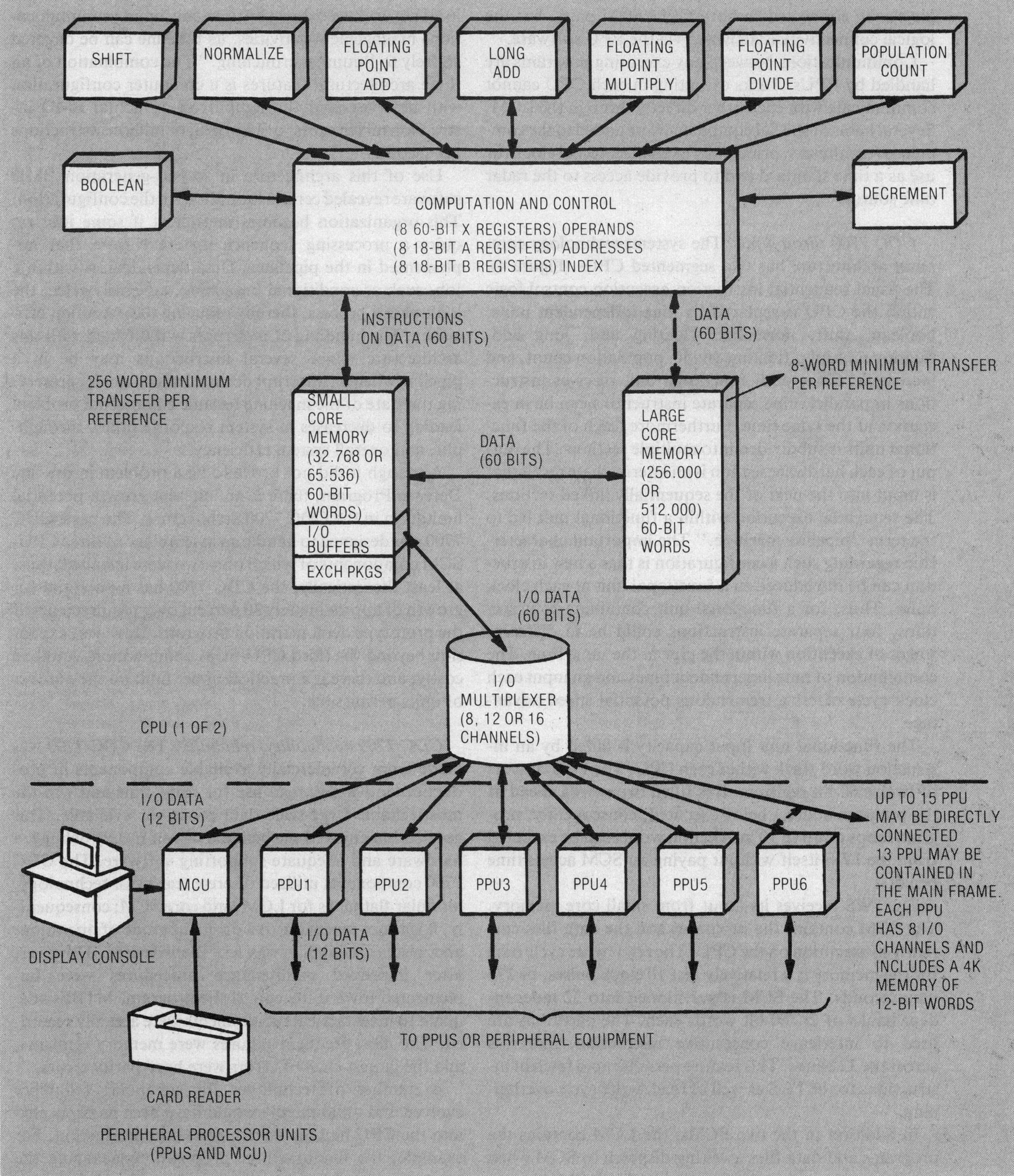 Each CPU/SCM pair is connected via an I/O multiplexer to several peripheral processor units. The PPUs act as stand-alone processors to interface external hardware with the central processor. The PPUs are physically connected to both CPU/SCM pairs, but the logical connectivity is activated via the PPU software.