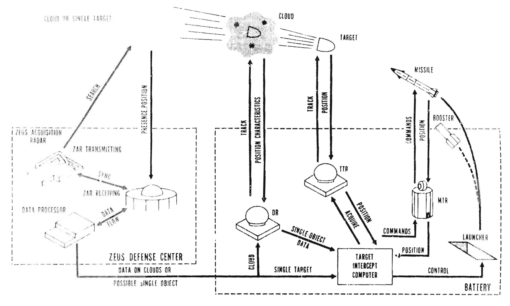 In defending against an ICBM attack, the Zeus Acquisition Radar would detect the incoming re-entry body or cloud and track the target and determine the threat value. If the target is unaccompanied by decoys, the ZAR would assign the battery target intercept computer and target track radar to carry the track. If the warhead is accompanied by a cloud of decoys, it would assign a discrimination radar. [*]