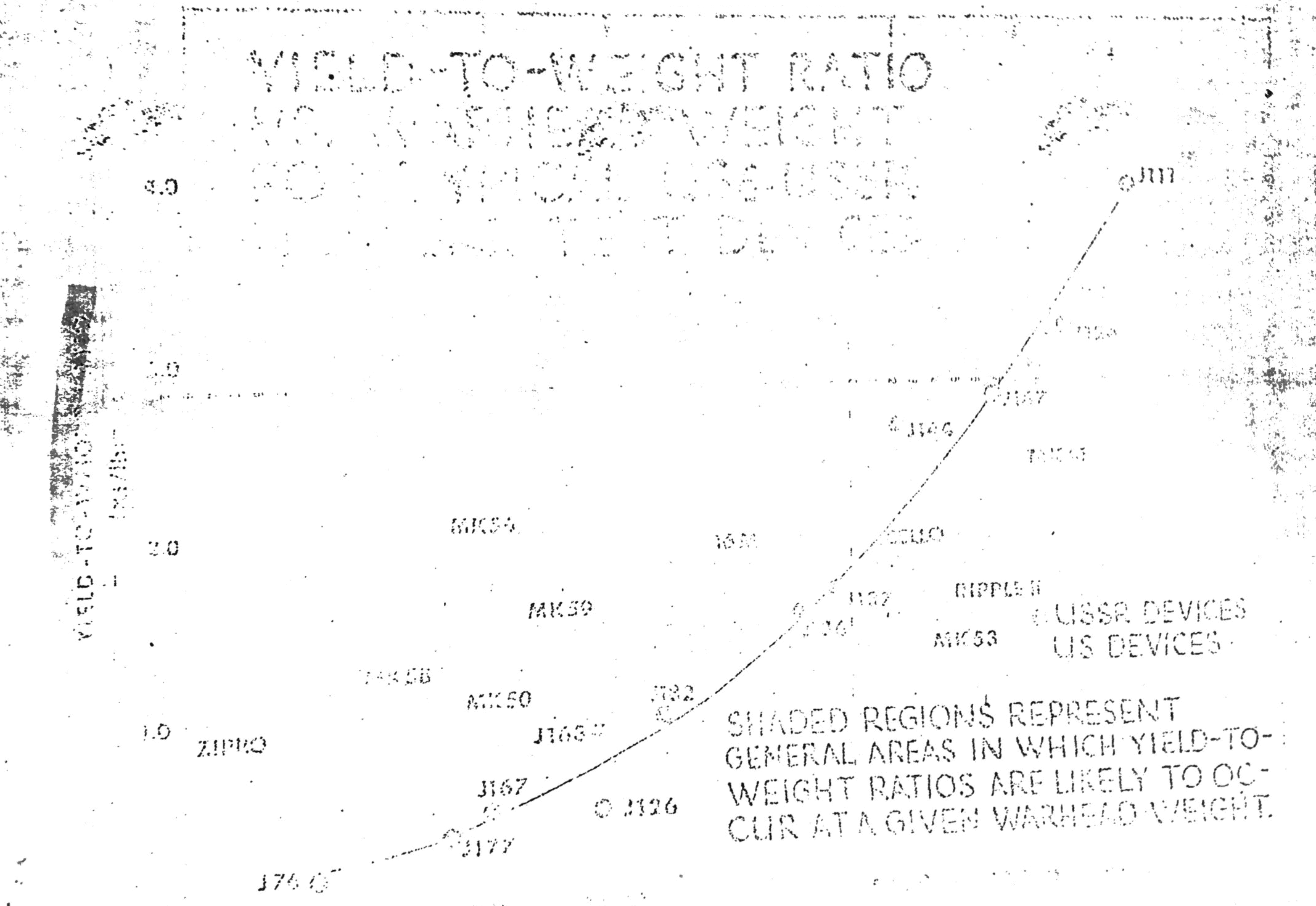 As you can see from the chart, the USSR appears superior to the US in yield-to-weight ratios in very high yield weapons. It is approximately equal to the US in medium and high yield weapons from 2 to 10 MT, though the US has an edge toward the lower end of this range. Below 2 MT the US has clear superiority in yield-to-weight ratios, and, in fact, we have detected no Soviet thermonuclear device less than 600 pounds and less than 150 KT.